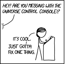 XKCD puts a woman in control of the universe, and it feels so good. This quick joke is worth the effort, even if you end up relying on the artist's explanation, like I did. Title text: Effect strength => [unstoppable] | Effect range => [2 miles] | Effect duration => [1 year] From the XKCD wiki:... Continue Reading →